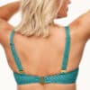 Gemaakt van een turquoise stof met subtiele glans en een elegant waaier-reliëfprint