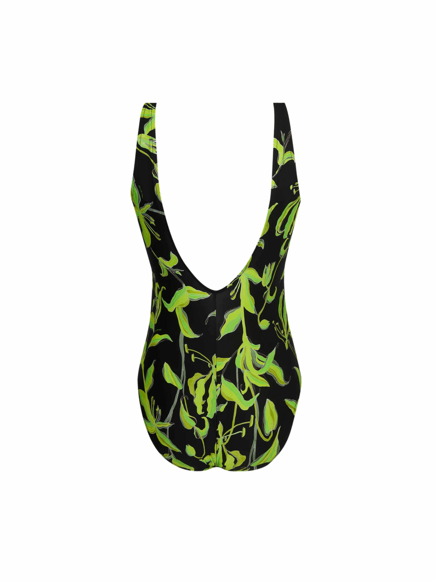 Badpak zonder beugels. Elastiek onder buste. Comfortabel, ultra vrouwelijkBadpak V decolleté, met geplaatst motief, getekend vooraan. Rug en vooraan gedubbeld. Elastiek onder de buste. Spaghetti vooraan verrijkt met een gouden kettingetje