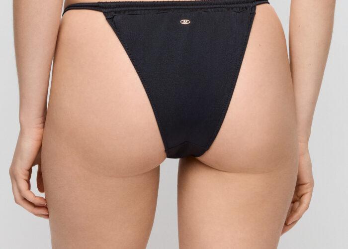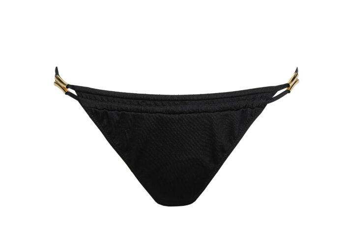 Sexy bikinislipje met fijne linten en gouden sierdetail opzij. Extra hoog uitgesneden – zo lijken je benen nog langer.