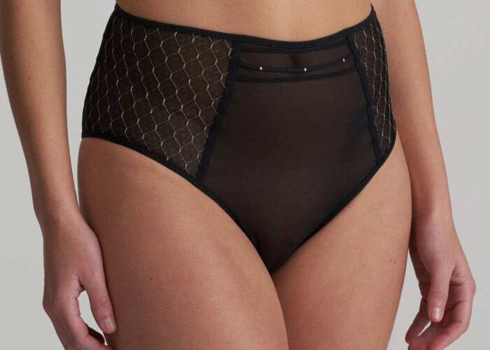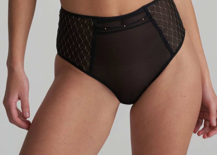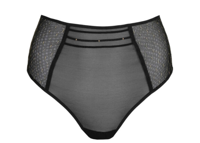 Deze speciale slip met hoge taille speelt met luxueuze mesh en gouden details. Fan van hotpants die het grootste deel van je billen bedekken? Deze speciale slip heeft dezelfde snit, maar valt hoger in je taille.