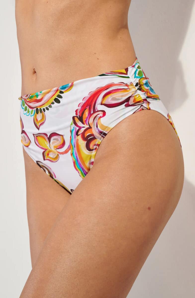 Het MISHI high-waisted bikinibroekje bedekt elegant de taille. Aan de zijkanten voegt de gedrapeerde stof textuur toe om de rondingen te accentueren, terwijl het subtiel oneffenheden gladstrijkt.