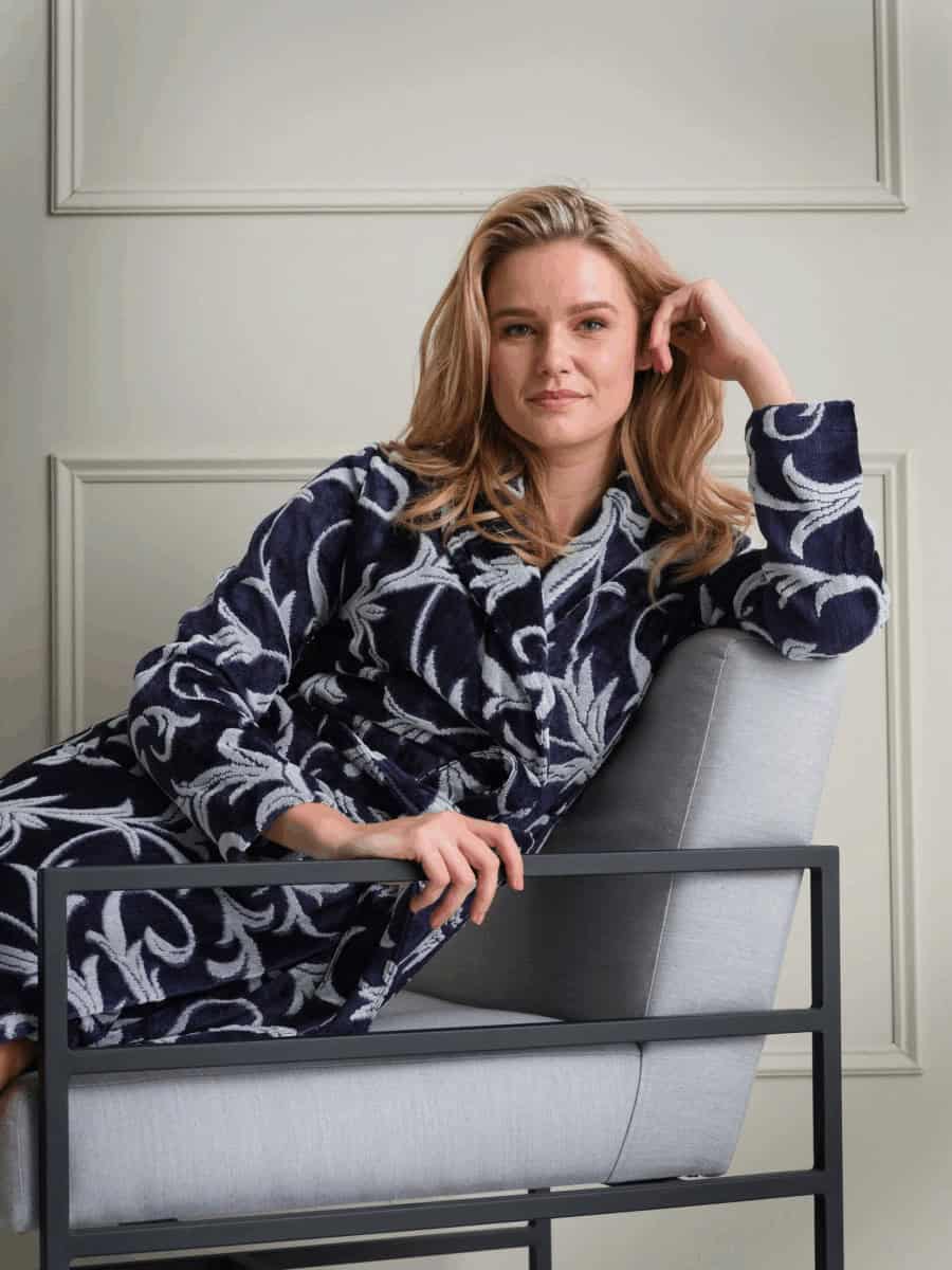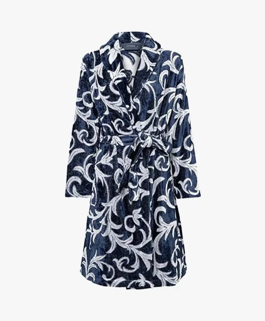 De ochtendjas is donkerblauw van kleur en heeft een all-over fantasie dessin in de kleur wit. De ochtendjas heeft lange mouwen. Verder heeft de ochtendjas een sjaalkraag en een v-hals. De jas is door middel van een ceintuur in de taille vast te maken. De jas heeft diepe steekzakken.