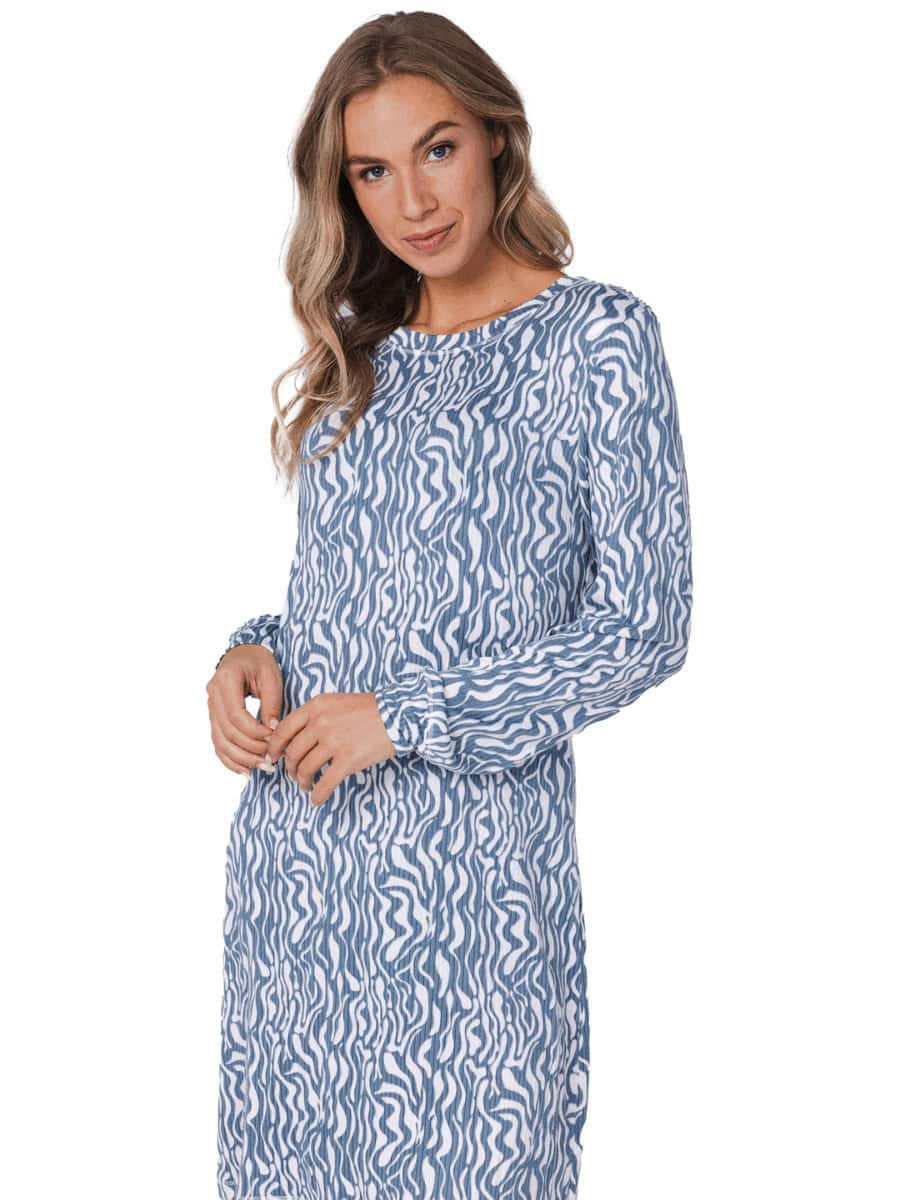 Dit mooie nachthemd komt uit de Blue Mirage serie van Pastunette. Het nachthemd is blauw en sneeuwwit van kleur en heeft een golvende fantasieprint.