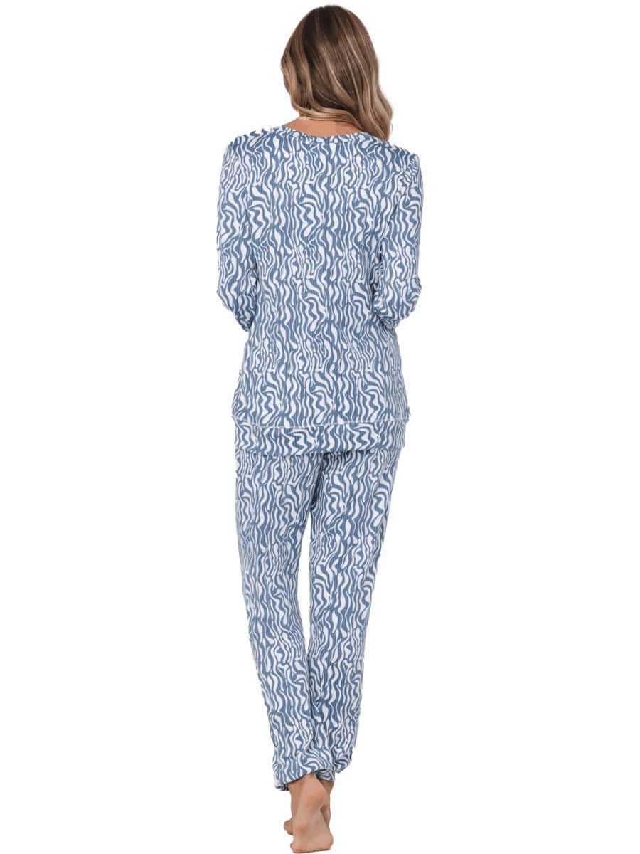 De set bestaat uit een top en een lange broek, beide uitgevoerd in een blauw kleur met een fantasierijk all-over dessin in sneeuwwit.