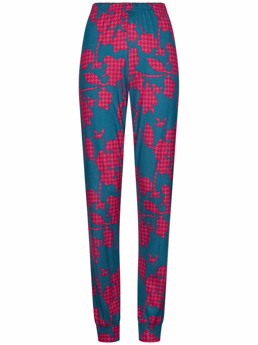 De pyjamaset is donker petrol groen van kleur en is voorzien van een elegante bloemenprint in roze. De top heeft een ronde hals en lange mouwen die zijn afgewerkt met boordjes. De bijpassende broek heeft een elastische tailleband en boordjes voor een optimale en comfortabele pasvorm.