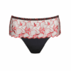 Luxestring met een hoge beenuitsnijding en stroken tule of kant aan je billen.Luxueuze combinatie van zwart en diep rood