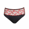 Tailleslip die hoger komt in de taille en je billen comfortabel bedekt. De benen zijn vooraan elegant uitgesneden.Luxueuze combinatie van zwart en diep rood