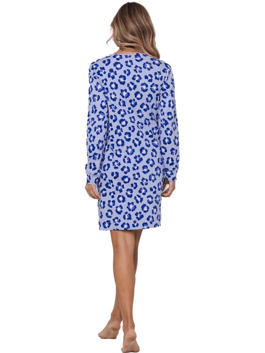 Het nachthemd is lichtpaars van kleur en heeft een all-over animalprint in paars en sneeuwwit. Het nachthemd heeft lange mouwen met boordjes en een ronde halslijn.
